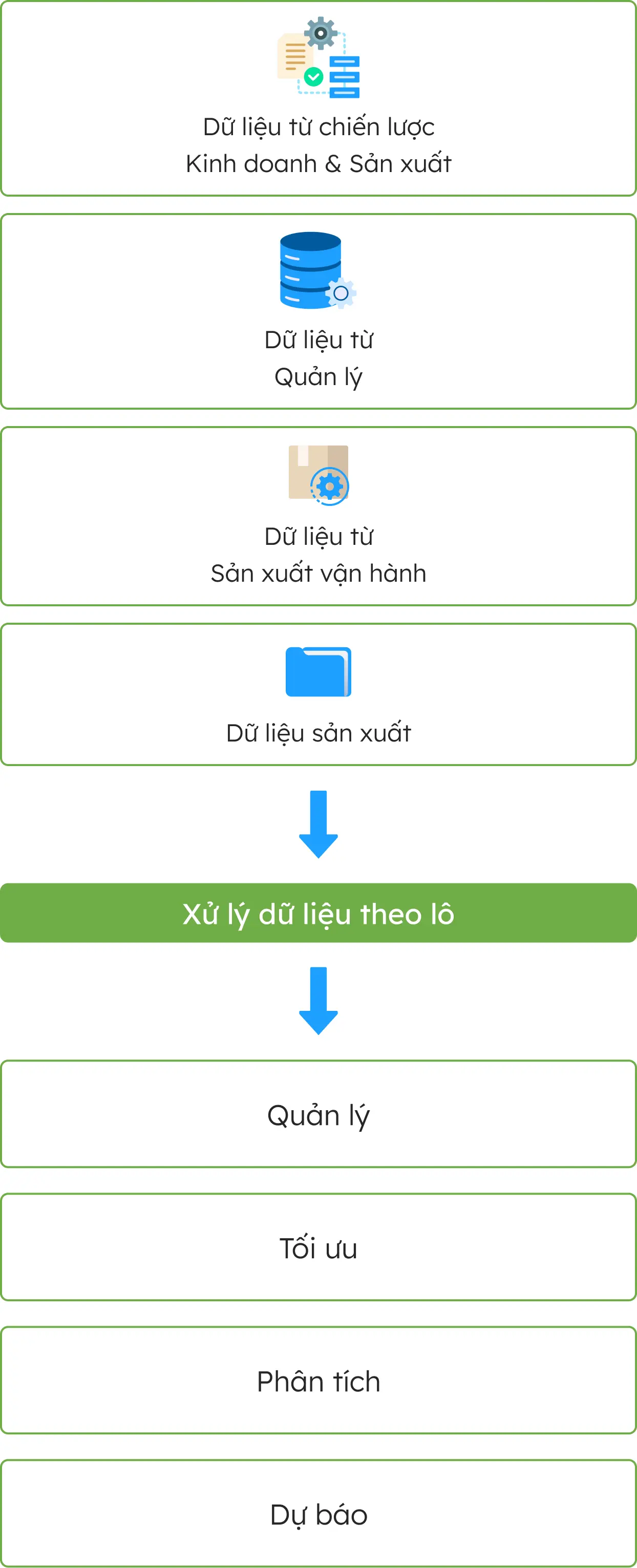 Giải pháp dữ liệu doanh nghiệp lớn: Tất cả các giải pháp trong Hệ sinh thái được vận hành trên một nền tảng chung, với dữ liệu tập trung. Từ đó các dữ liệu của nhiều dịch vụ khác nhau bên trong một hoặc nhiều dự án được quy về một kho dữ liệu, giúp tối ưu công tác dự báo, phân tích, quản lý cho nhà quản lý.