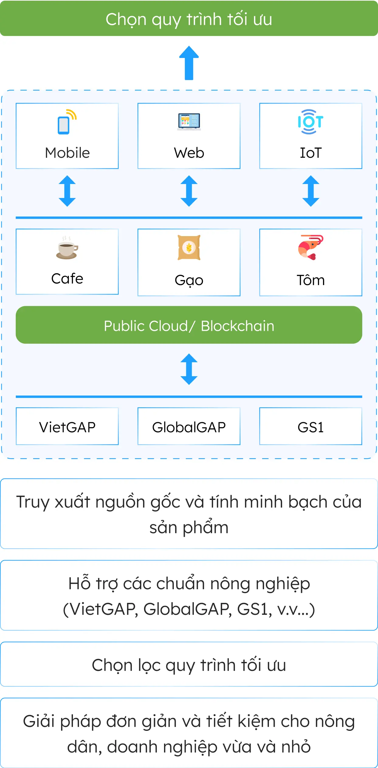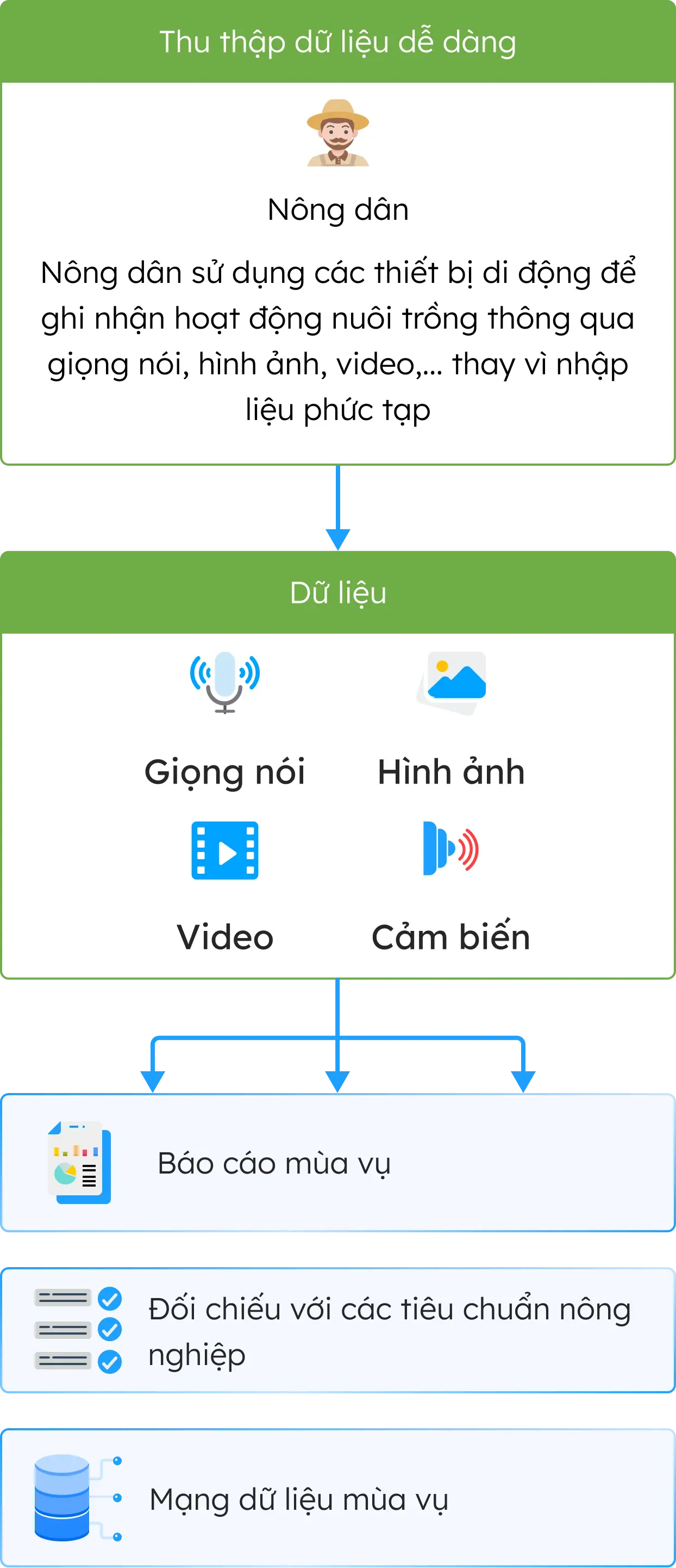 Giải pháp Nông nghiệp thông minh: Phần mềm trên điện thoại di động hỗ trợ nông dân và các doanh nghiệp thu thập, lưu trữ và phân tích dữ liệu về quá trình nuôi trồng, hỗ trợ đạt chuẩn VietGAP, GlobalGAP, GS1,... Truy xuất nguồn gốc sản phẩm và tối ưu hóa mùa vụ giúp tăng giá trị và chất lượng các sản phẩm nông nghiệp.