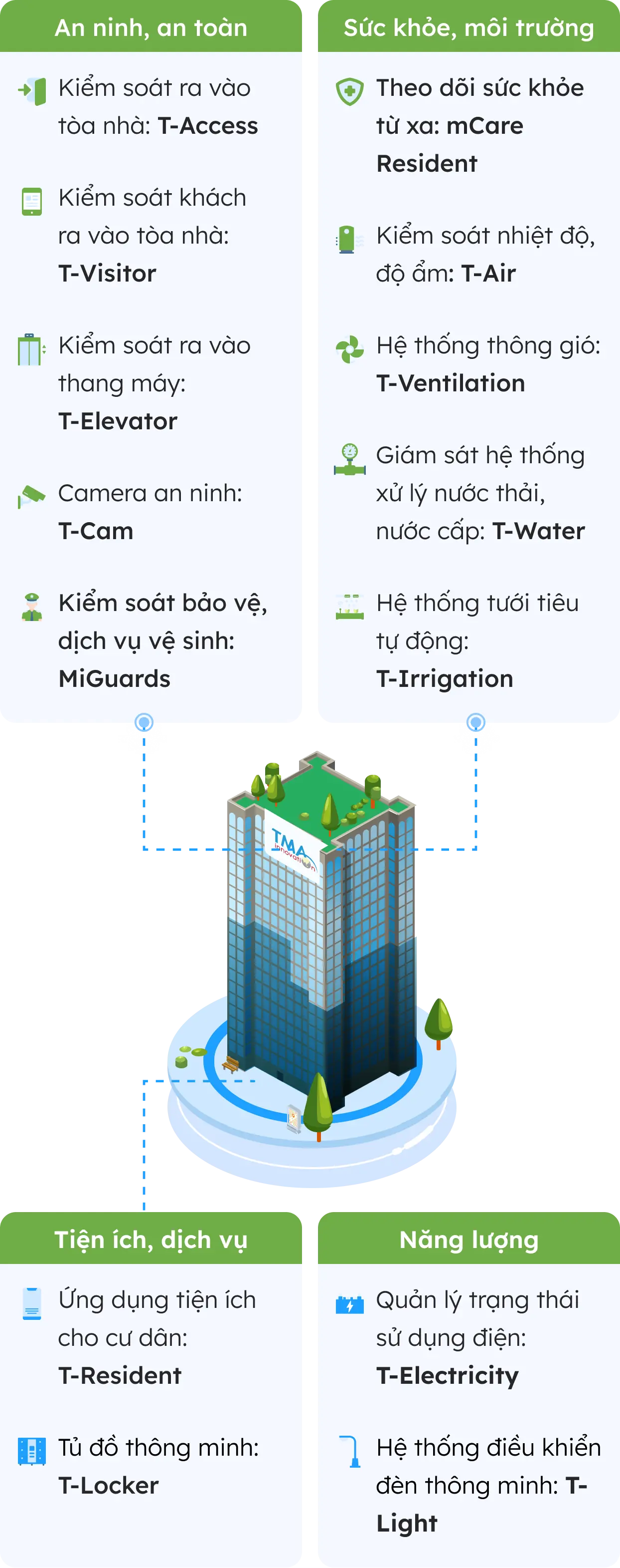 - Tòa nhà thông minh - Smart building: Hệ sinh thái các giải pháp công nghệ nhằm đảm bảo an ninh - an toàn, tối ưu hóa tiện ích cư dân, và nâng cao chất lượng tòa nhà