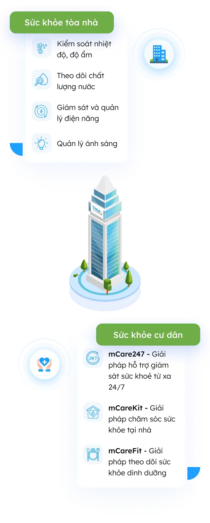 Giải pháp tòa nhà & khu dân cư thông minh: Giải pháp mở và toàn diện cho toà nhà, khu dân cư - đô thị nhằm kiến tạo cuộc sống hiện đại, lành mạnh cho cư dân, tối ưu hóa quản lý và vận hành, nâng tầm giá trị bất động sản.