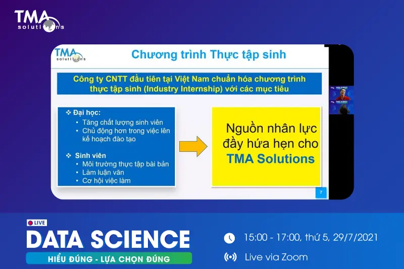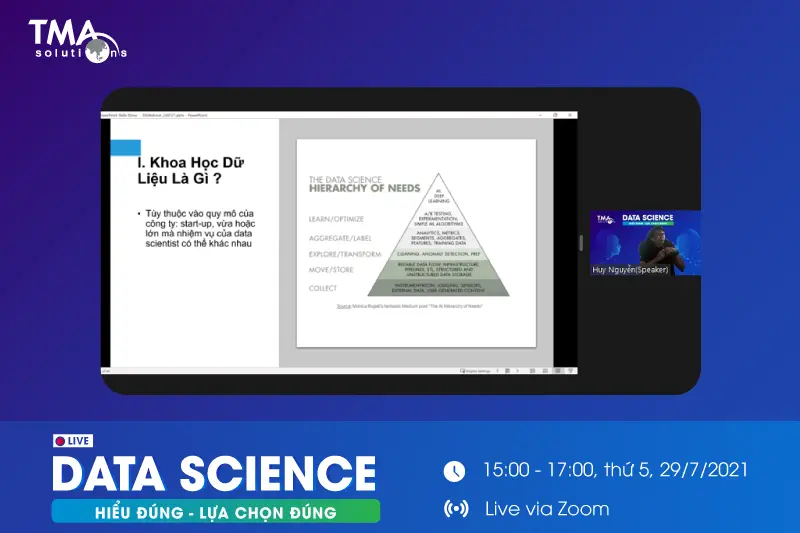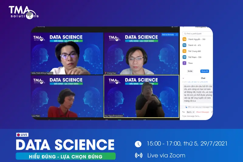 Vào ngày 29/7 vừa qua, TMA đã tổ chức webinar "Data Science: Hiểu đúng - Lựa chọn đúng" trực tiếp qua Zoom, thu hút gần 300 bạn đăng ký tham dự, bao gồm cả sinh viên, những bạn đã đi làm hoặc đang theo học thạc sĩ.