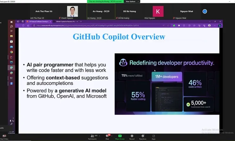 Ngày 11/08/2023, qua nền tảng zoom, seminar "AI-Powered Software Development Tools" với nội dung về các công cụ AI phổ biến có thể hỗ trợ đắc lực cho Developers và Testers đã thu hút hơn 500 kỹ sư TMA tham gia. Trong buổi seminar, các thành viên cùng thảo luận về các công cụ AI phổ biến như GitHub Copilot, Amazon CodeWhisperer & TestSigma cùng một số công cụ khác như AWS CodeGuru, AWS DevopsGuru, DeepCode AI và cách sử dụng chúng để tự động hóa các tác vụ phát triển phần mềm và cách cải thiện chất lượng phần mềm trong dự án.