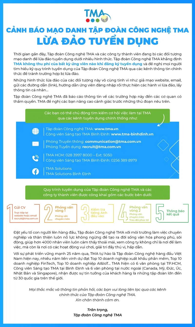 Cảnh báo mạo danh Tập Đoàn Công nghệ TMA lừa đảo tuyển dụng