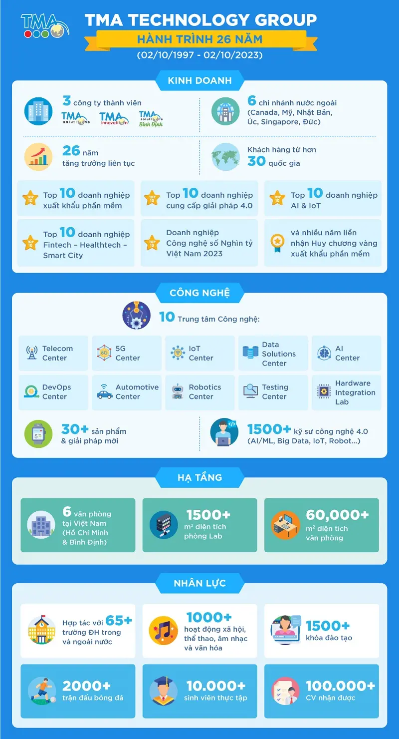 Sau 26 năm xây dựng và phát triển, vượt qua nhiều giai đoạn khủng hoảng của kinh tế thế giới, TMA đã xác lập và duy trì vị thế Tập đoàn Công nghệ hàng đầu Việt Nam với 3 công ty thành viên, 6 văn phòng trong nước, 6 văn phòng tại nước ngoài cùng đội ngũ 4.000 nhân viên với nhiều danh hiệu và phần thưởng. Nhân kỷ niệm 26 năm thành lập, Tập đoàn Công nghệ TMA chúc tất cả các anh chị em nhân viên tập đoàn luôn dồi dào sức khỏe, hạnh phúc và cùng tiếp tục nỗ lực, sát cánh xây dựng Tập đoàn Công nghệ TMA phát triển vững mạnh, vươn tầm khu vực và thế giới.