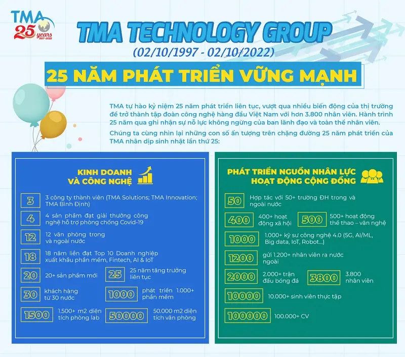 TMA tự hào kỷ niệm 25 năm phát triển liên tục, vượt qua nhiều biến động của thị trường để trở thành tập đoàn công nghệ hàng đầu Việt Nam với hơn 3.800 nhân viên. Hành trình 25 năm qua ghi nhận sự nỗ lực không ngừng của ban lãnh đạo và toàn thể nhân viên.