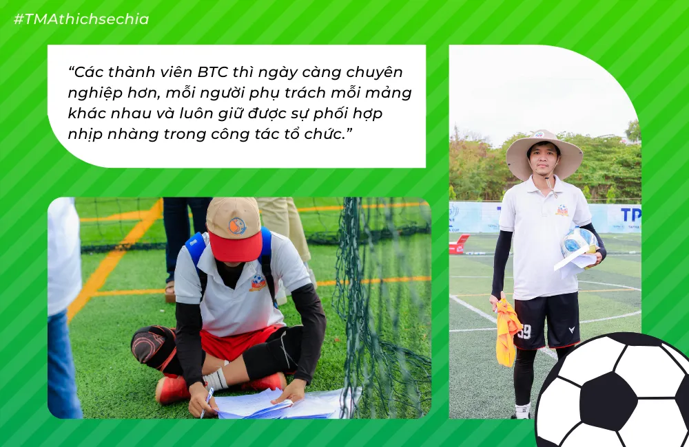 Ký ức đáng nhớ nhất của anh chính là những trận đấu quyết định ngôi vô địch. Những pha bóng kịch tính, những tình huống bất ngờ khiến trận đấu gián đoạn và sự phối hợp nhanh chóng của BTC với trọng tài để đảm bảo trận đấu tiếp tục diễn ra trọn vẹn. Và khi trận đấu khép lại, cảm giác nhẹ nhõm và tự hào về một giải đấu thành công tốt đẹp luôn đọng lại trong lòng anh và các thành viên BTC.