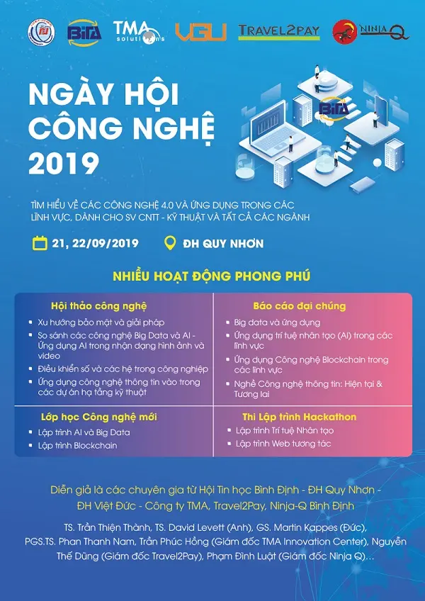 Ngày 21-22/09 tới đây, ngày hội Công nghệ 2019 do TMA phối hợp cùng đại học Quy Nhơn tổ chức sẽ diễn ra tại đại học Quy Nhơn. Với nhiều nhiều khóa học, cuộc thi hấp dẫn, đây là sân chơi công nghệ lớn nhất trong năm tại Quy Nhơn - Bình Định; Là nơi giao lưu, chia sẻ các xu hướng, giải pháp công nghệ mới nhất hiện nay, nơi hội tụ các chuyên gia công nghệ trong và ngoài nước.