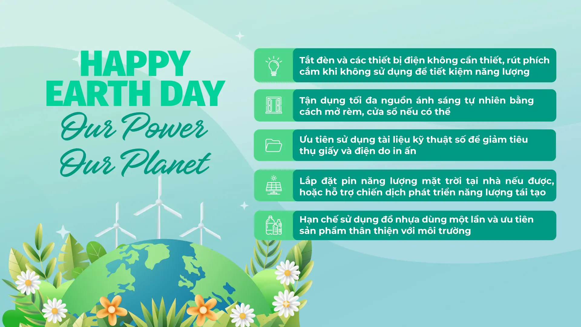 Hưởng ứng Ngày Trái đất 2025, TMA kêu gọi các thành viên tiết kiệm năng lượng và góp sức phát triển năng lượng tái tạo với những “tips” sau đây: