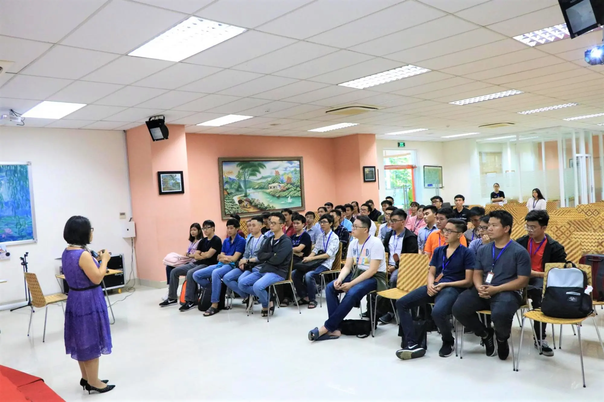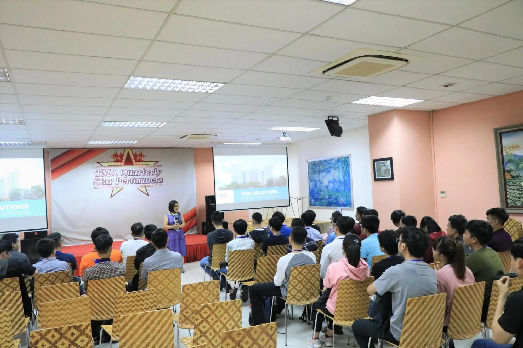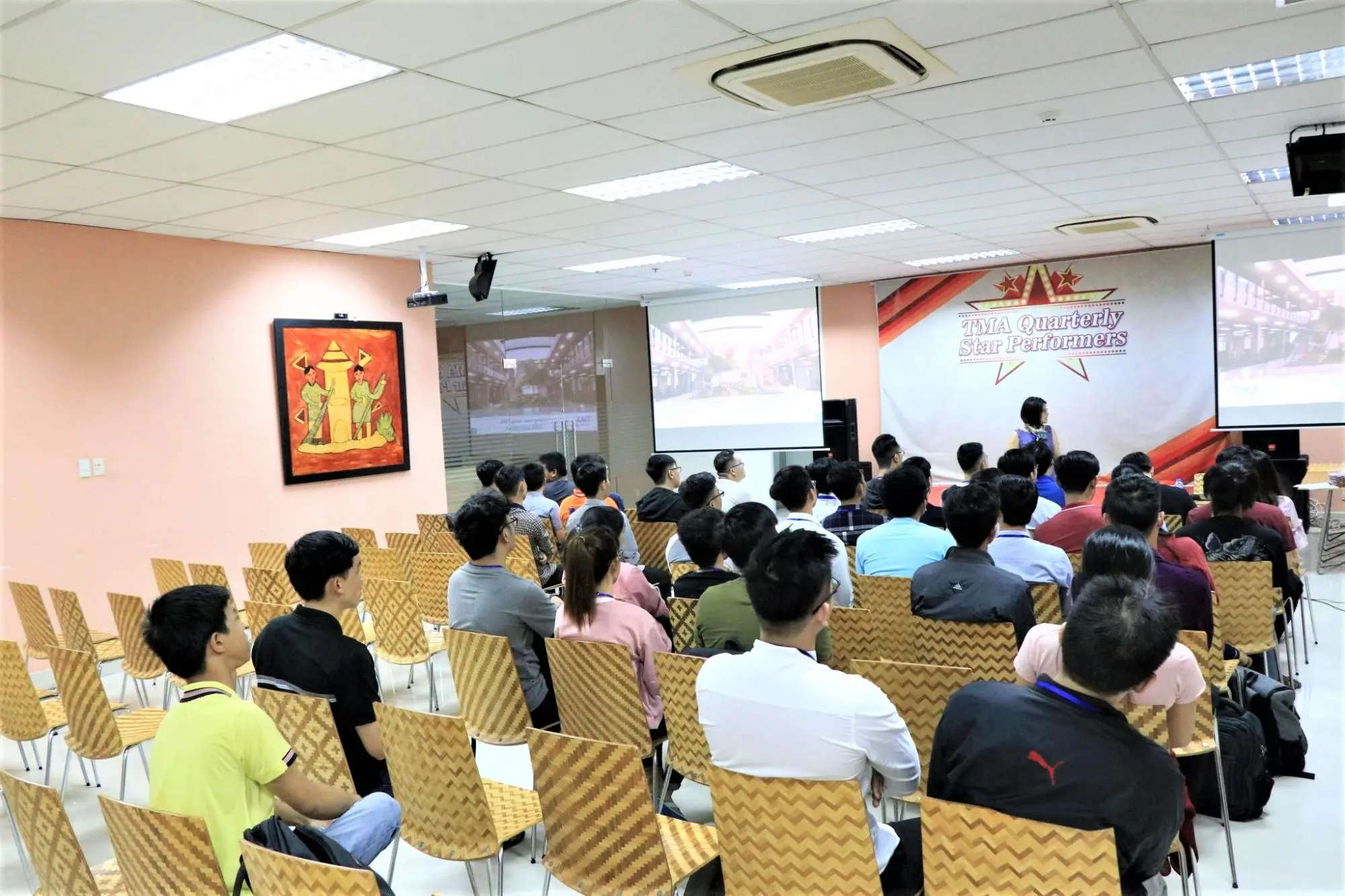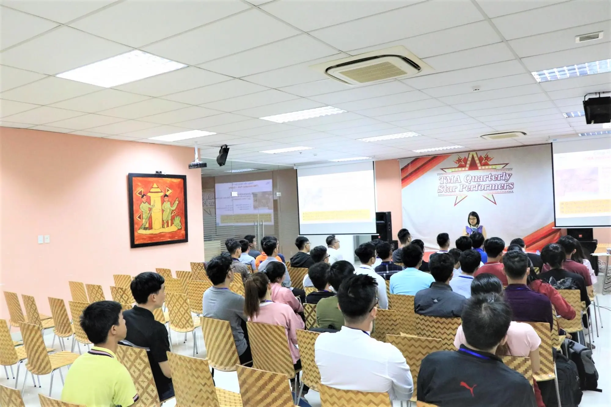 Tại đây, chị Trang Bùi – Senior Manager của bộ phận Training đã chia sẻ về văn hóa, môi trường làm việc của công ty, các chính sách thực tập, lộ trình làm việc và training cụ thể để các bạn hiểu rõ hơn về chương trình thực tập của mình trong từ 2-3 tháng tiếp theo. Chị Trang Bùi cũng chia sẻ về cơ hội được trở thành nhân viên chính thức của công ty chỉ sau 2 tháng làm việc cùng mức lương và phúc lợi hấp dẫn. Đặc biệt là về sự án TMA Innovation Park đang được triển khai tại Bình Định.