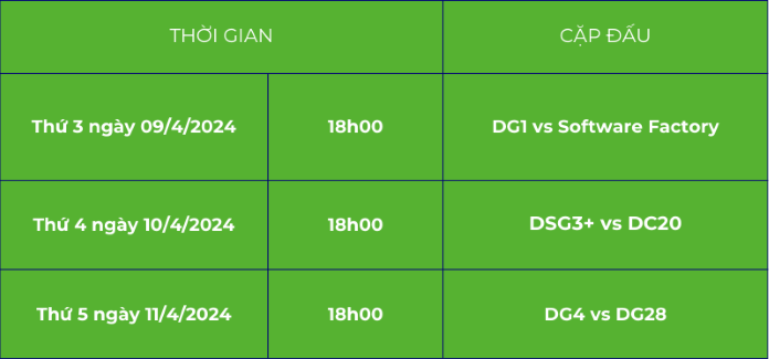 DC20 sẽ có cuộc đối đầu nảy lửa với những “chiến binh” của DSG3+. Dù là đương kim vô địch của mùa giải 2023, nhưng DC20 lại chưa thể hiện phong độ mạnh mẽ khi để thua tại lượt trận trước trước DG4. Đây sẽ là cơ hội để họ lấy lại danh dự. Bên cạnh đó, sau 1 tuần nghỉ ngơi, Software Factory sẽ ra sân gặp DG1. Liệu có cơ hội nào dành cho DG1 để có trong tay 3 điểm đầu tiên?