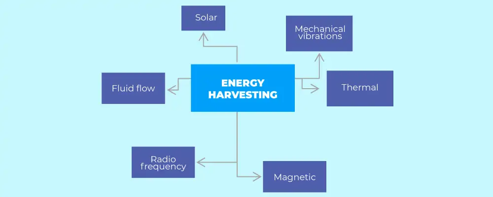 Hình 1 miêu tả các dạng năng lương khác nhau có thể được dùng cho việc thu thập năng lượng hiện nay. Trong đó, năng lượng thu được từ rung động cơ học (mechanical vibration) có thể thu thập từ các phương pháp điện từ, tĩnh điện, hoặc áp điện và được ứng dụng rộng rãi trong máy móc công nghiệp với ưu điểm là hoạt động ở tần số thấp và điện áp ngõ ra cao (điện xoay chiều), tuy nhiên đây cũng là khuyết điểm vì cần mạch cộng hưởng tần số và chuyển đổi sang dòng điện một chiều cho các thiết bị điện khác. Tiếp theo, năng lượng thu thập từ nhiệt (thermal) thường thấy trong nhiệt thải công nghiệp, hay động cơ đốt trong. Ưu điểm của phương pháp này là hoạt động được ở nhiệt độ phòng và đáp ứng phổ rộng, tuy nhiên khuyết điểm là cần sự thay đổi nhiệt độ theo chu kỳ và thường vẫn chỉ được thu thập dưới dạng điện xoay chiều. Phương pháp sử dụng năng lượng từ (magnetic) hầu như cũng gặp vấn đề tương tự, dựa vào cường độ điện từ trường để cho ra dòng điện xoay chiều. Đặc biệt, phương pháp sử dụng năng lượng mặt trời (solar) và dòng chảy chất lỏng (fluid flow) rất thường thấy trong các thiết bị hiện nay vì đơn giản và nguồn năng lượng dễ thu thập, tuy nhiên khuyết điểm là phụ thuộc vào năng lượng mặt trời và điều kiện thời tiết, thủy triều. Phương pháp sử dụng sóng vô tuyến để thu thập năng lượng hữu ích trở thành một phương pháp rất tiềm năng cho các thiết bị IoT và WSN ngày nay. Năng lượng vô tuyến có mặt khắp mọi nơi, là một dạng năng lượng có hiệu suất thu thập cao hơn các loại khác, và có thể dễ dàng chuyển đổi sang dòng điện một chiều. Khuyết điểm của phương pháp này là với các băng tần khác nhau sẽ cần thay đổi phần cứng đi kèm. Để khắc phục việc này, các mạch điều chỉnh băng tần (tuning) được thiết kế để phát triển ứng dụng. Ngoài ra phương pháp này cũng đang cần sự nhất quán, thống nhất từ các tổ chức về qui chuẩn để phát triển trong tương lai.