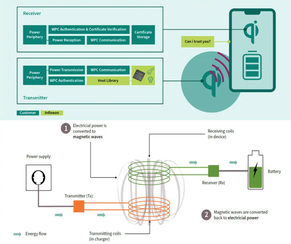 Tập trung vào hai công nghệ sạc không dây chính, cảm ứng từ và cộng hưởng tần số, đồng thời cung cấp đa dạng mẫu mã và sản phẩm an toàn để sử dụng trong các lĩnh vực tiêu dùng, công nghiệp và ô tô, bao gồm từ vài watt đến vài kilowatt. Các giải pháp của Infineon bao gồm IC nguồn MOSFET, IC sạc không dây, vi điều khiển, IC trình điều khiển cổng và IC xác thực (OPTIGA™ Trust Charge, 15 W và 50 W). Giải pháp sạc không dây Infineon đáp ứng nhu cầu ngày càng tăng hiện nay đối với các ứng dụng sạc không dây như điện thoại thông minh, thiết bị đeo tay, máy tính xách tay và là thành viên của Hiệp hội Wireless Power Consortium (WPC). Tiêu chuẩn Qi qui định bởi hiệp hội WPC phản ánh mức truyền tải điện không dây đến các thiết bị điện tử nhỏ với mục đích cung cấp khả năng tương thích và an toàn cho thiết bị, và do đó góp phần vào việc đảm bảo an toàn cho người tiêu dùng. Tiêu chuẩn Qi2 bắt buộc sử dụng phần cứng được chứng nhận bảo mật để bảo vệ quá trình xác thực. Tuy nhiên công nghệ nghệ có khuyết điểm là khoảng cách truyền quá ngắn chỉ vài centimet và không thể ứng dụng được cho các thiết bị IoT ở khoảng cách xa.