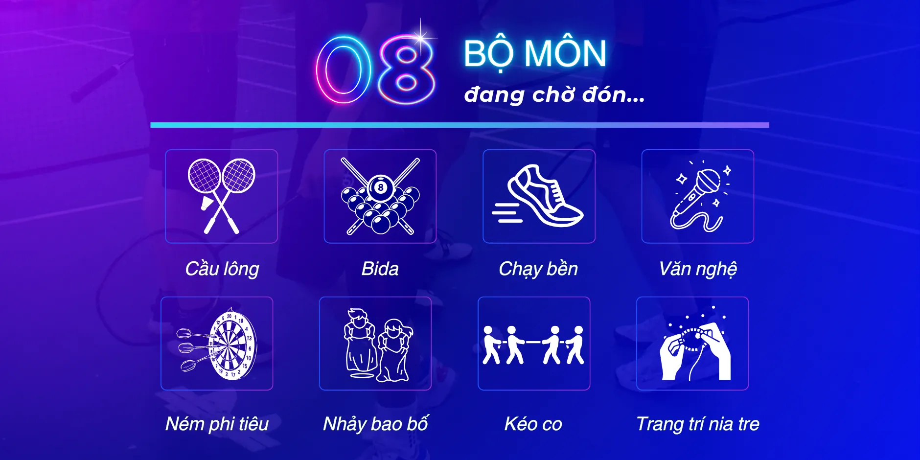 Theo đó, các bộ môn cần nhiều thời gian thi đấu như Cầu lông, Bida, Chạy bền và Văn nghệ sẽ được sắp xếp diễn ra trước, nhận giải vào Sport Day. Thông tin chi tiết về địa điểm, lịch thi đấu của từng bộ môn sẽ được cập nhật sớm đến tất cả các bạn! Còn chần chừ gì nữa, hãy nhanh tay “chốt đơn” bộ môn thi đấu và tìm kiếm đồng đội, lập team cùng tham gia ngay hôm nay!