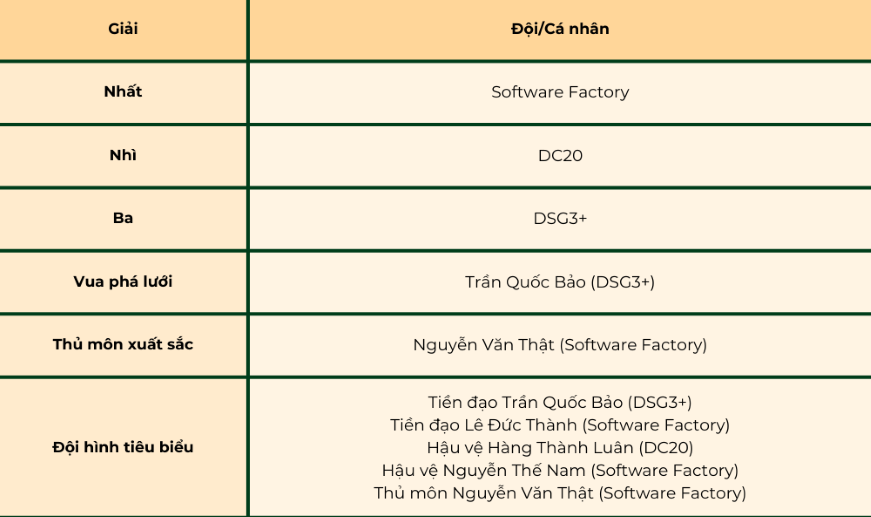 Trong trận đấu cuối cùng của mùa giải, Software Factory (SF) đã vào sân với một quyết tâm mãnh liệt, đặt mục tiêu giành chiến thắng vang dội để vượt qua DC20 và đoạt chức vô địch. Ngay từ những phút đầu tiên, các cầu thủ SF đã tràn lên tấn công như vũ bão, tạo áp lực khủng khiếp lên khung thành của đối thủ. Thế trận nhanh chóng nghiêng hẳn về phía SF khi bộ ba tấn công Thế Nam, Đức Thành và Hoàng Phúc thể hiện sự ăn ý hoàn hảo. Họ liên tục phối hợp nhuần nhuyễn và ghi bàn như “nơi không người”, mang về cơn mưa bàn thắng cho đội nhà. Sự xuất sắc của hàng công đã giúp SF hủy diệt DG28 với tỉ số không tưởng 14-1. Với chiến thắng này, SF đã vượt lên DC20 một cách ngoạn mục nhờ cách biệt 1 bàn về hiệu số bàn thắng, chính thức trở thành tân vương của TMA Bình Định Futsal League 2024.