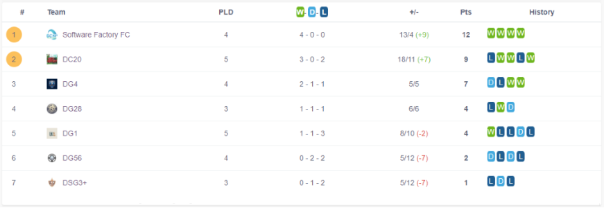 Khác với những nhận định ban đầu, cả 2 đội đều nhập cuộc chắc chắn với động thái thăm dò đối thủ. Sau đó ít phút, trận đấu đã cởi mở hơn với những pha ăn miếng trả miếng đem lại nhiều giây phút sôi động cho khán giả. Đến nửa hiệp 1, bài toán tổ chức tấn công của hai đội mới thực sự hiệu quả khi Software Factory dẫn trước mở tỉ số trận đấu nhờ công của chân sút Hoàng Phúc. Điều này đã “kích thích” công lực của DC20 được đẩy cao hơn nữa. Không lâu ít phút sau đó, nhờ vào pha chuyền xuống chính xác từ đồng đội, Văn Thế (DC20) bức tốc chạy xuống vào vị trí đón bóng thuận lợi, không chần chừ mà sút thẳng vào khung thành đối phương, cân bằng lại tỉ số hòa 1-1, kết thúc hiệp 1.