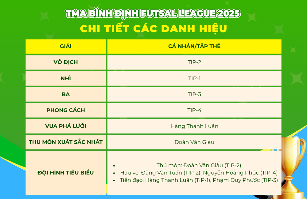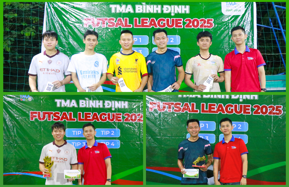 Tại buổi Lễ Bế mạc, những danh hiệu cá nhân, tập thể cao quý của TMA Bình Định Futsal League 2025 đã được trao cho chủ nhân xứng đáng. Cùng với đó, BGĐ cũng gửi lời cảm ơn, khích lệ đến các cầu thủ, cổ động viên và BTC vì đã cùng nhau làm nên một mùa giải thật nhiều cảm xúc và thành công.