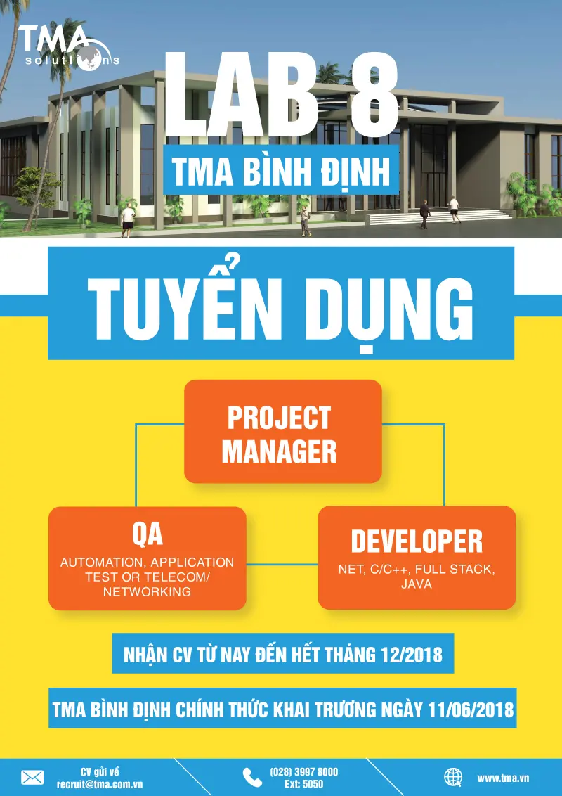 Chỉ còn chưa đầy 2 tháng nữa, vào ngày 11/06/2018, văn phòng TMA tại Bình Định - Lab 8 sẽ đi vào hoạt động. Tất cả chúng ta hẳn rất háo hức để được chứng kiến khoảnh khắc TMA chính thức xuất hiện tại mảnh đất Bình Định thân thương.