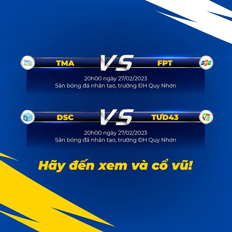 Ngay tối nay, 27/02, đội TMA và đội DSC sẽ ra quân để chiến đấu cùng lần lượt 2 đối thủ là FPT và TƯD43. Hãy đến xem và tiếp sức cho các cầu thủ!