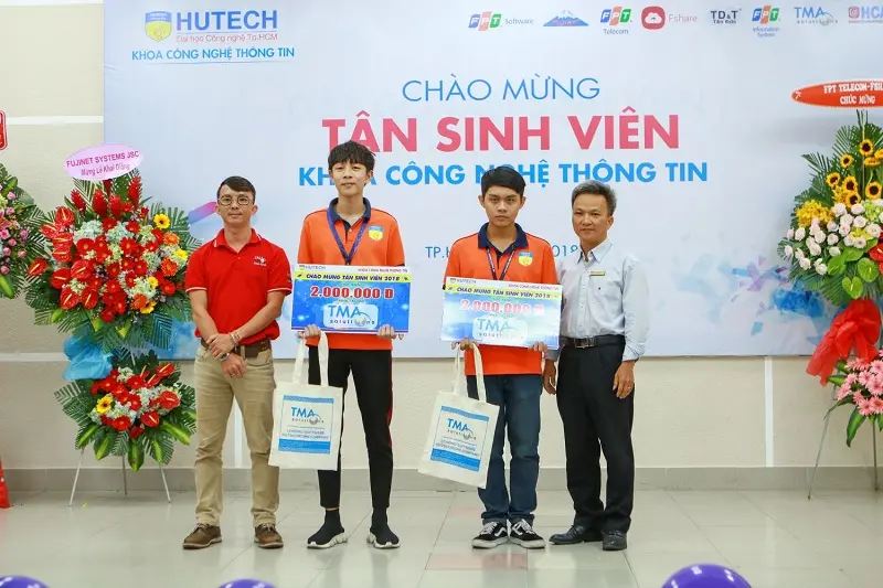 Chưa hết, tại "Ngày hội chào đón Tân SV khoa CNTT" của ĐH HUTECH, đại diện TMA, anh Hiệp Phan đã trao hai suất học bổng ý nghĩa đến các bạn sinh viên có thành tích học tập tốt và có những chia sẻ ý nghĩa về nghề nghiệp, tạo niềm tin cho các em vững bước trên con đường mình đã chọn.