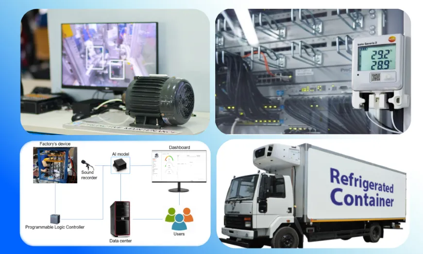 - Giám sát nhiệt độ cho xe container: Giải pháp giám sát nhiệt độ cho hệ thống kho lạnh. Giải pháp này hỗ trợ nhân viên kho theo dõi hoạt động rã đông hàng ngày của kho lạnh và ngăn ngừa các lỗi ngoài ý muốn cũng như tối ưu hóa chi phí vận hành.