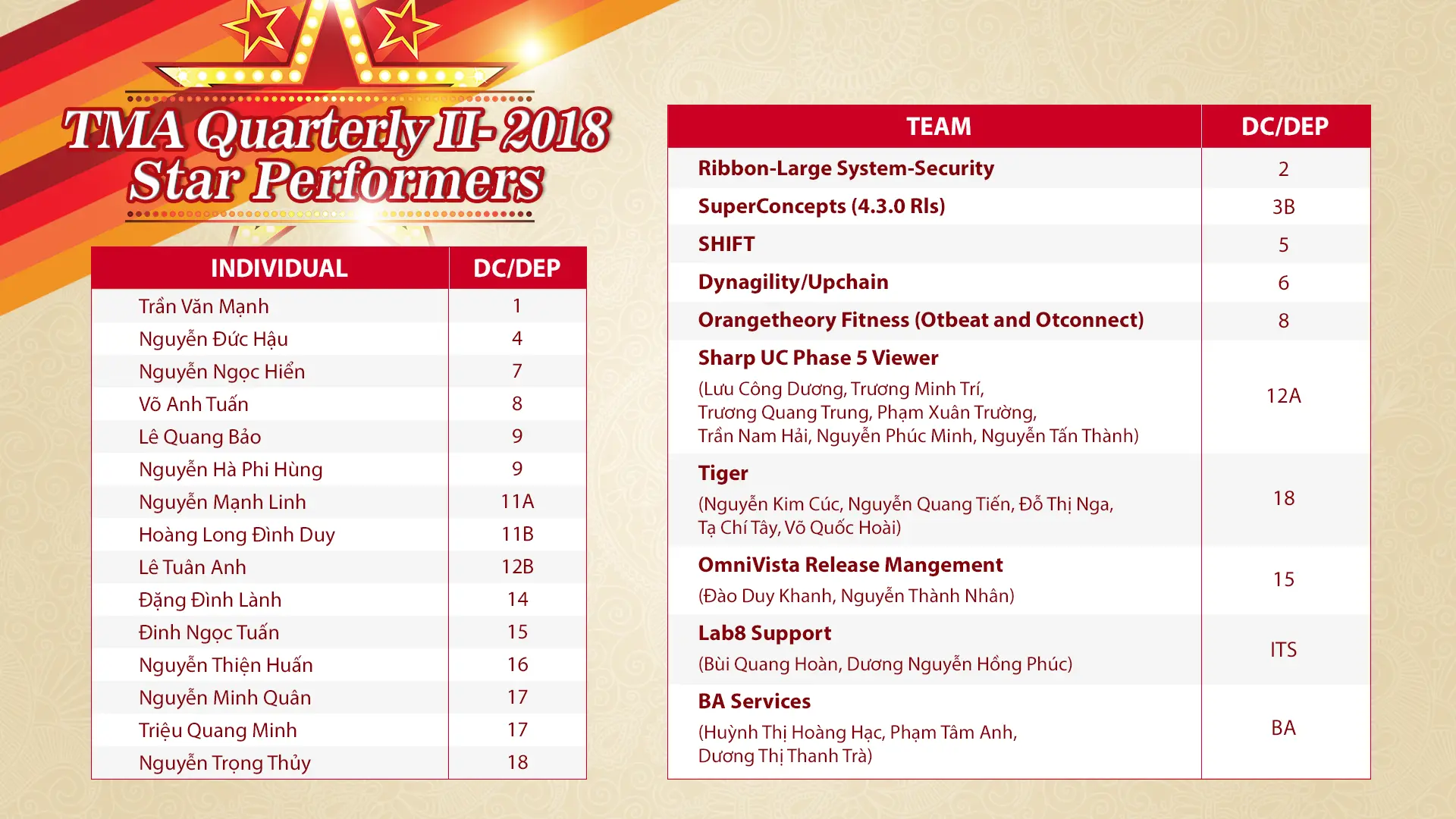 Sau thời gian cân nhắc kỹ lưỡng của Ban giám đốc, 25 cá nhân/nhóm có thành tích nổi bật nhất Quý II/2018 đã lộ diện. Với những nỗ lực tuyệt vời của mình, họ đã giúp nhóm, dự án vượt qua những thử thách khó nhằn, mang về cho công ty những thành quả tốt, những phản hồi vô cùng tích cực từ khách hàng.