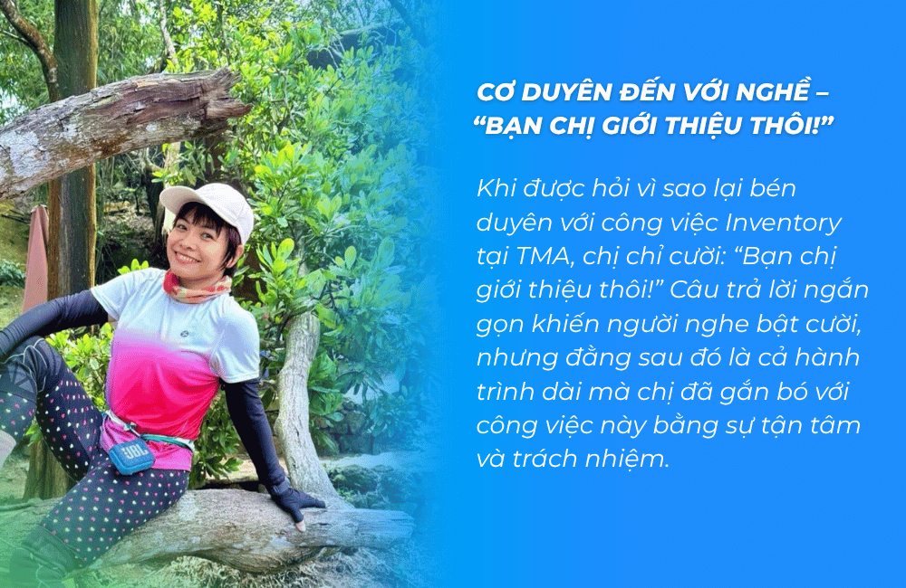 Khi được hỏi vì sao lại bén duyên với công việc Inventory tại TMA, chị chỉ cười: “Bạn chị giới thiệu thôi!” Câu trả lời ngắn gọn khiến người nghe bật cười, nhưng đằng sau đó là cả hành trình dài mà chị đã gắn bó với công việc này bằng sự tận tâm và trách nhiệm. Mỗi ngày của chị trôi qua với hàng loạt đầu việc: xử lý ticket, trả lời thắc mắc của user, nhập thiết bị, kiểm tra tồn kho, đảm bảo các nhu yếu phẩm, thiết bị và công cụ luôn sẵn sàng phục vụ cho nhân viên. Công việc nhiều và lặp lại, nhưng chị vẫn luôn giữ thái độ nhẹ nhàng, chuyên nghiệp và không quên thêm chút hài hước để bớt căng thẳng. “Công việc thì vui cũng phải làm, không vui cũng phải làm, nên chọn cách nào khiến mình thoải mái, dzui dzẻ xíu cho không khí đỡ nặng nề hơn.” - chị hóm hỉnh chia sẻ.