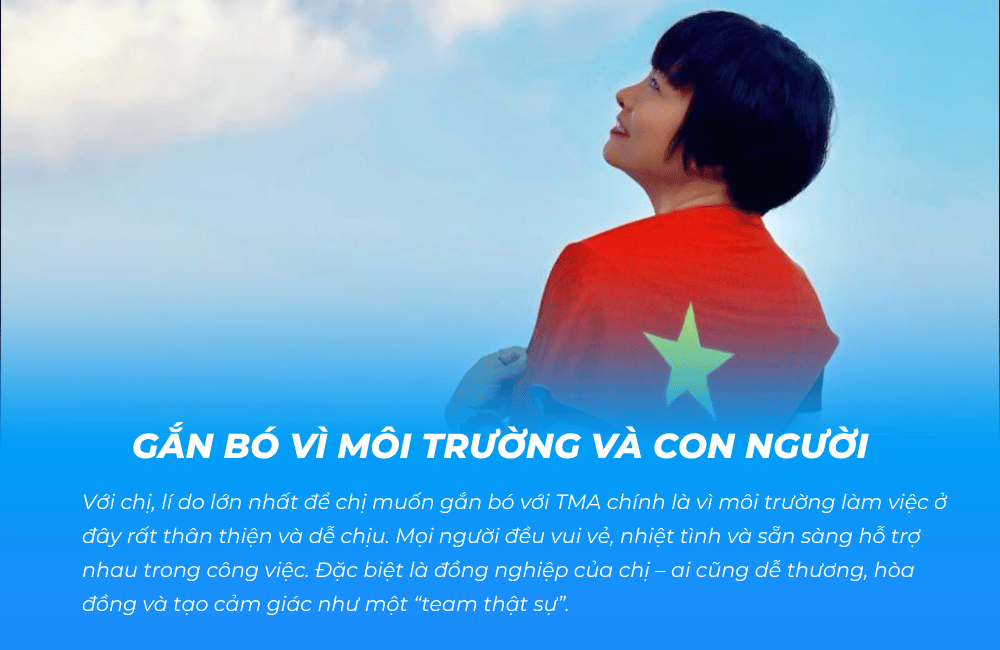 Với chị, lí do lớn nhất để chị muốn gắn bó với TMA chính là vì môi trường làm việc ở đây rất thân thiện và dễ chịu. Mọi người đều vui vẻ, nhiệt tình và sẵn sàng hỗ trợ nhau trong công việc. Đặc biệt là đồng nghiệp của chị – ai cũng dễ thương, hòa đồng và tạo cảm giác như một “team thật sự”, chứ không chỉ là những người cùng làm chung công ty. Nhờ vậy mà dù có những lúc công việc áp lực hay căng thẳng, chị vẫn cảm thấy mọi thứ nhẹ nhàng hơn rất nhiều.