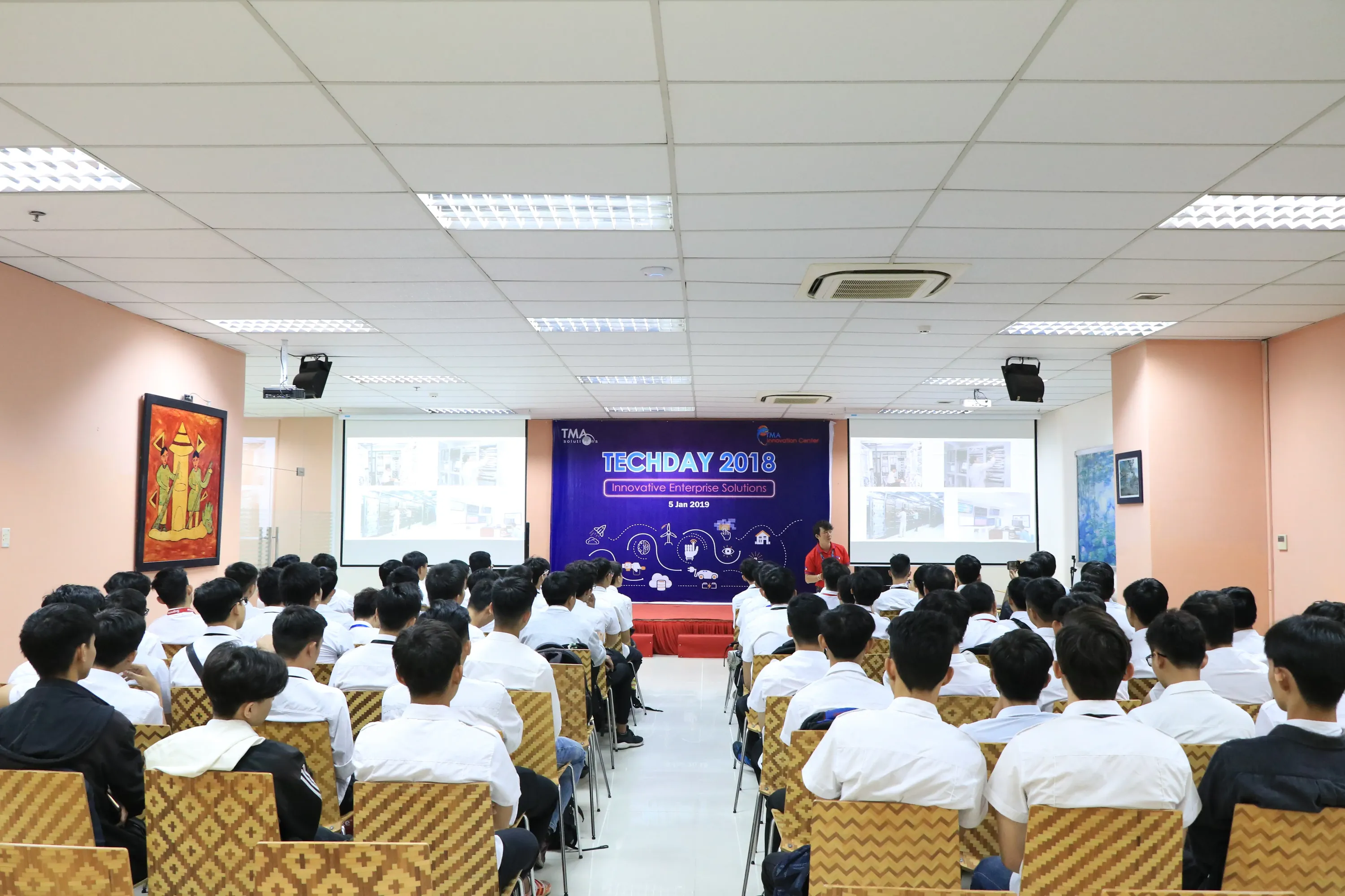 Tiếp đó, TMA cũng tiếp đón gần 100 bạn sinh viên từ trường ĐH Công nghiệp đến tham quan vào ngày 28/02. Buổi trao đổi diễn ra trong không khí sôi nổi với nhiều câu hỏi về các cơ hội thực tập và tuyển dụng Fresher tại TMA. Không chỉ có vậy, các bạn cũng được tham quan TMA Network Operation Center và TIC, trao đổi với các anh/ chị phụ trách nhằm có cho mình một định hướng rõ ràng trong sự nghiệp sau này.