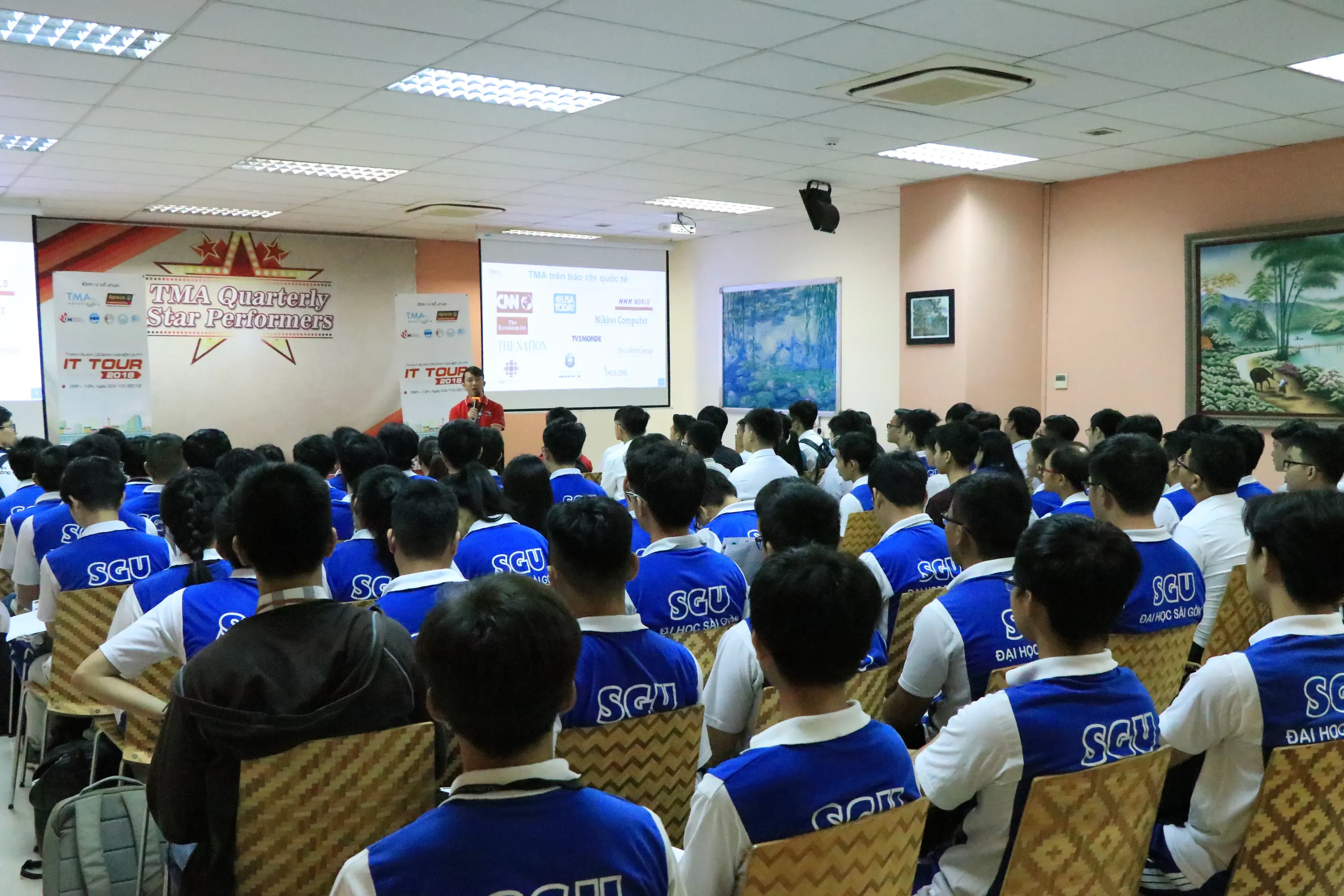 Tháng 10 này, TMA tưng bừng tiếp đón các bạn sinh viên trường ĐH Công Nghiệp, ĐH Tôn Đức Thắng, ĐH Tài Chính – Marketing, ĐH Trà Vinh và Aptech Việt Nam đến tham quan công ty. Nhiều kiến thức bổ ích và kinh nghiệm thực tiễn đã được các anh, chị đại diện TMA, đại diện các dự án truyền đạt tận tình tới các bạn.