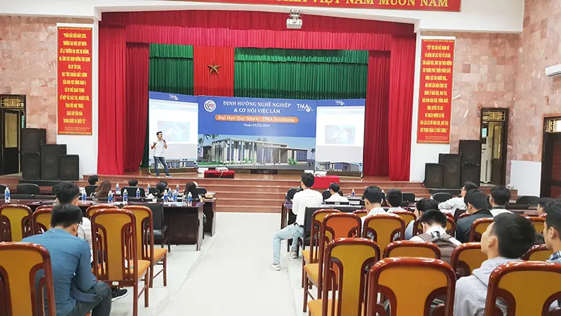 Ngày 05/05, chú Lệ cùng các anh, chị đại diện TMA đã có mặt tại trường ĐH Quy Nhơn (Bình Định) để giao lưu trực tiếp và tư vấn hướng nghiệp cho hơn 300 sinh viên các ngành Công nghệ thông tin, Kỹ thuật Điện - Điện tử, Kỹ thuật Điện tử - Truyền thông và các bạn ứng viên quan tâm.