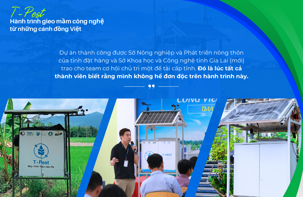 Với mong muốn đóng góp nhiều hơn nữa cho nền nông nghiệp Việt Nam, T-Pest tập trung triển khai tại các huyện/xã ở Bình Định (cũ) để thử nghiệm, nghiên cứu, đồng thời hướng tới mục tiêu lớn hơn là mở rộng dự án này trên toàn quốc và giới thiệu đến các bạn bè quốc tế. Cuối cùng, “ngọn lửa đam mê” ấy đã may mắn nhận được sự tin tưởng từ các cơ quan nhà nước. Dự án thành công được Sở Nông nghiệp và Phát triển nông thôn của tỉnh đặt hàng và Sở Khoa học và Công nghệ tỉnh Gia Lai (mới) trao cho team cơ hội chủ trì một đề tài cấp tỉnh. Đó là lúc tất cả thành viên biết rằng mình không hề đơn độc trên hành trình này.