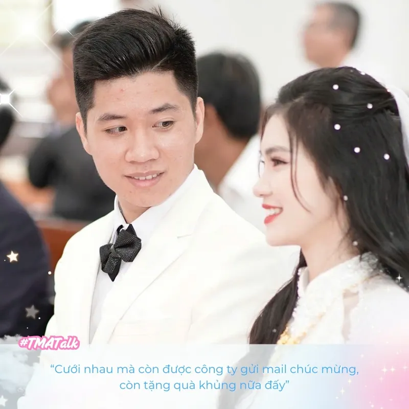 Hành trình nên duyên tại TMA của Hằng và Nguyên cũng được đồng nghiệp và công ty hết sức ủng hộ. Cặp đôi chia sẻ rằng họ cảm thấy rất vui mừng, xen lẫn tự hào khi nhận được sự quan tâm đặc biệt từ công ty, đặc biệt là chính sách thưởng kết hôn dành cho nhân viên “Cưới nhau mà còn được công ty gửi mail chúc mừng, còn tặng quà khủng nữa đấy”.