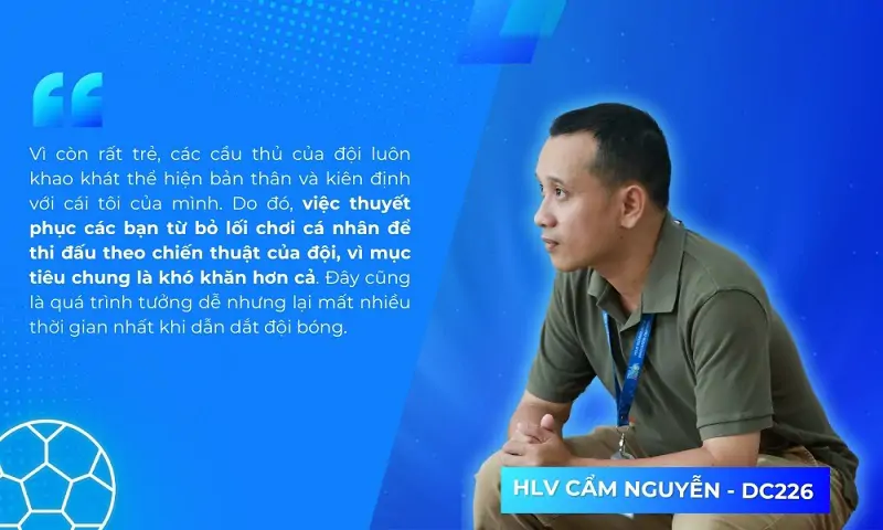 Ngôi vị vô địch mà DC226 đạt được không chỉ khẳng định năng lực của đội bóng trẻ, mà còn phản ánh sự tâm huyết, chính xác trong định hướng và chiến thuật của huấn luyện viên Cầm. Tuy nhiên, hành trình đến thành công chắc chắn không chỉ có hoa hồng. Anh Cầm chia sẻ: “Vì còn rất trẻ, các cầu thủ của đội luôn khao khát thể hiện bản thân và kiên định với cái tôi của mình. Do đó, việc thuyết phục các bạn từ bỏ lối chơi cá nhân để thi đấu theo chiến thuật của đội, vì mục tiêu chung là khó khăn hơn cả. Đây cũng là quá trình tưởng dễ nhưng lại mất nhiều thời gian nhất khi dẫn dắt đội bóng”. Từ đó, với kinh nghiệm không chỉ được tích lũy từ những trận đấu mà còn qua việc học hỏi từ các đội bóng khác trong giải đấu, anh tạo dựng một nền tảng vững chắc, hỗ trợ đội bóng phát triển lối chơi toàn diện hơn. Bên cạnh đó, sức trẻ và quyết tâm của các cầu thủ cũng đóng vai trò quan trọng, là những yếu tố then chốt góp phần tạo nên thành công rực rỡ của DC226.