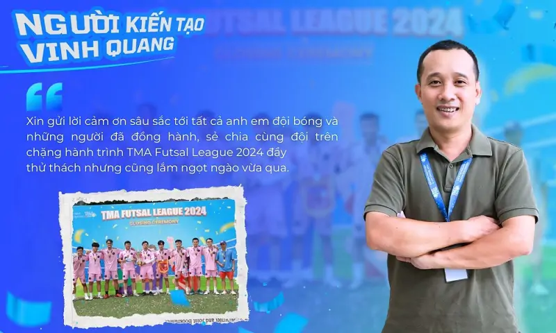 Chạm tay đến ngôi vị vô địch League B, HLV Cầm Nguyễn không thể giấu niềm hạnh phúc. Với anh, đây là kết quả từ sự nỗ lực không ngừng của toàn đội, một tập thể đầy khát khao và bền bỉ, cùng sự đồng hành quý báu từ ban lãnh đạo DC22, DC26 và những cổ động viên nhiệt thành.”Xin gửi lời cảm ơn sâu sắc tới tất cả anh em đội bóng và những người đã đồng hành, sẻ chia cùng đội trên chặng hành trình TMA Futsal League 2024 đầy thử thách nhưng cũng lắm ngọt ngào vừa qua”, anh Cầm gửi gắm.