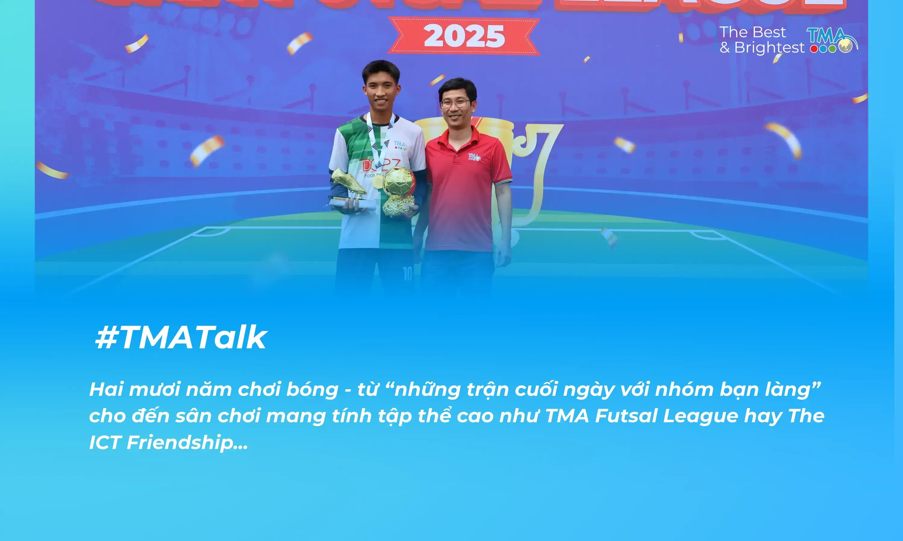 Khải Minh đã gắn bó với phong trào thể thao tại TMA suốt nhiều năm, trong đó bóng đá là bộ môn tạo dấu ấn lớn nhất. Hai mươi năm chơi bóng – từ “những trận cuối ngày với nhóm bạn làng” cho đến sân chơi mang tính tập thể cao như TMA Futsal League (TFL) hay The ICT Friendship (ICT) – đã giúp anh nuôi dưỡng lòng bền bỉ, tinh thần đồng đội và niềm yêu thích vận động. Với Khải Minh, bóng đá giống như một dòng chảy xuyên suốt hành trình của anh tại TMA. Suốt bốn mùa góp mặt tại TFL và ICT, anh luôn giữ một tinh thần thi đấu tràn đầy nhiệt huyết. Anh kể: “Những giải đấu ở TMA giúp mình cảm nhận rõ tinh thần tập thể, điều mà mình trân trọng nhất khi chơi bóng.”