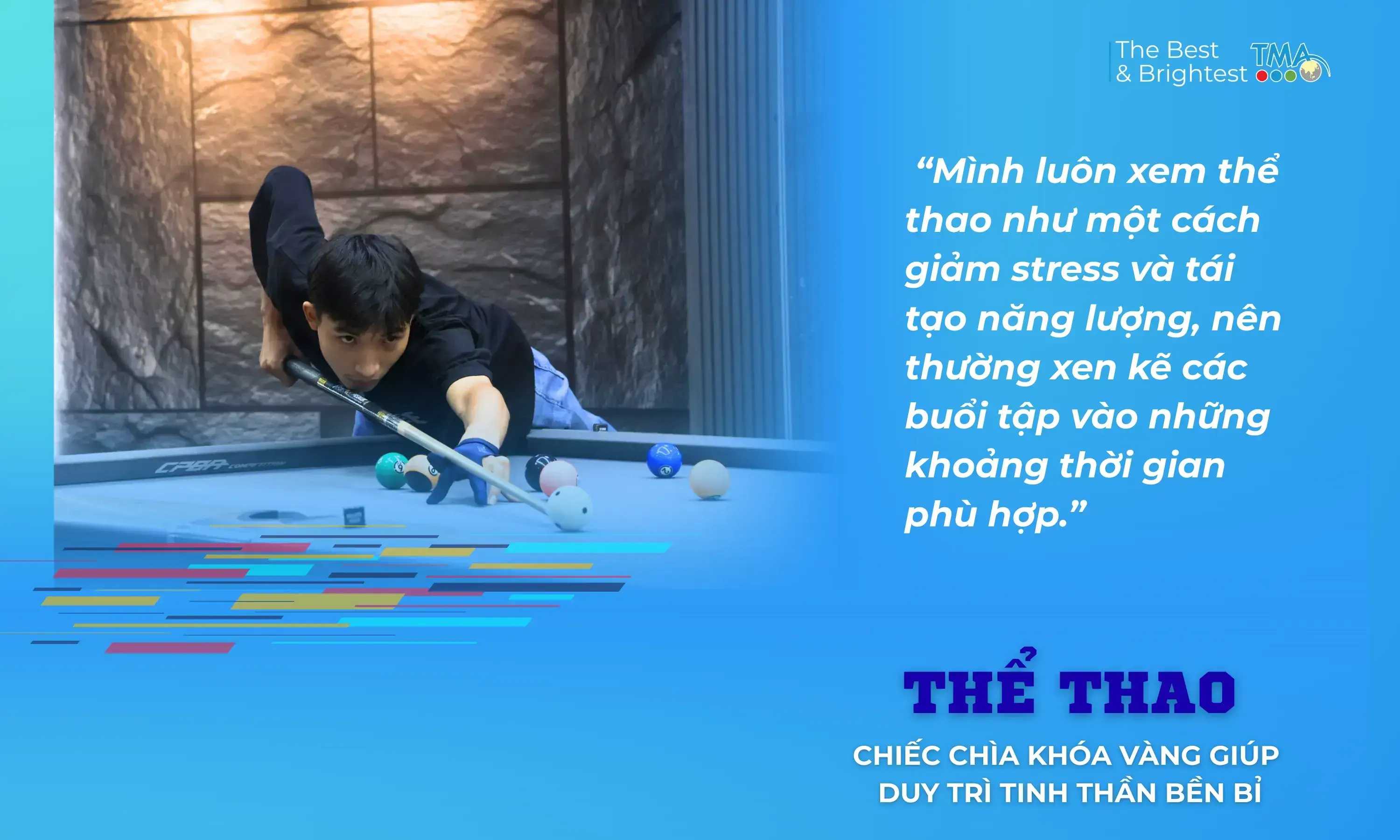 Không dừng lại ở đó, Minh còn thử sức với bida và cờ vua để rèn luyện khả năng tập trung và tư duy chiến thuật. Anh chia sẻ: “Mỗi bộ môn đều dạy cho mình một kiểu kiên nhẫn khác nhau.”